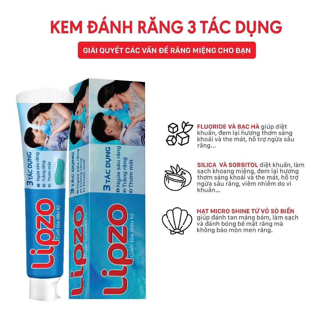Kem đánh răng Lipzo 3 Tác Dụng với thành phần chiết xuất thiên nhiên giúp Ngừa Sâu Răng, Trắng Răng, Thơm Miệng.