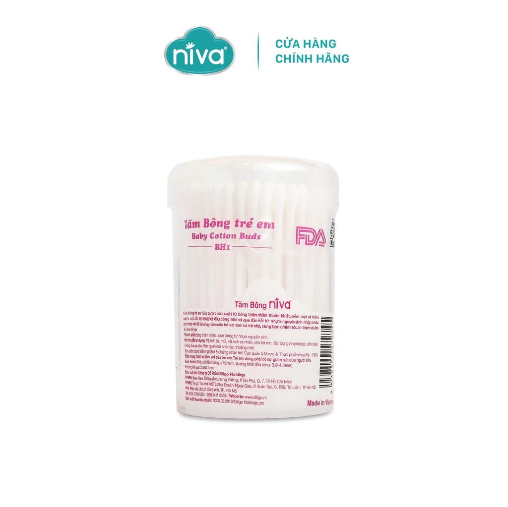 Tăm bông trẻ em Niva BH1 được làm từ 100% bông y tế nhập khẩu từ Mỹ. Sử dụng công nghệ sản xuất hiện đại khép kín của Nhật Bản, là sản phẩm duy nhất sản xuất tại Việt Nam đạt chứng nhận FDA (Hoa Kỳ).